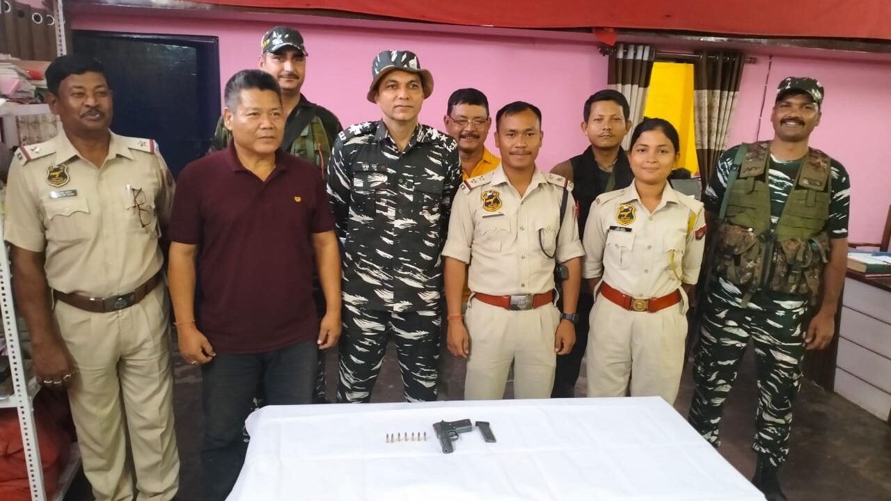 BOKAJAN, May 09: The Karbi Anglong police recovered a pistol and ammunition from a bus passenger during a search conducted inside a bus at a special checkpoint near the Khatkhati SBI office under the Khatkhati Police Station here today.