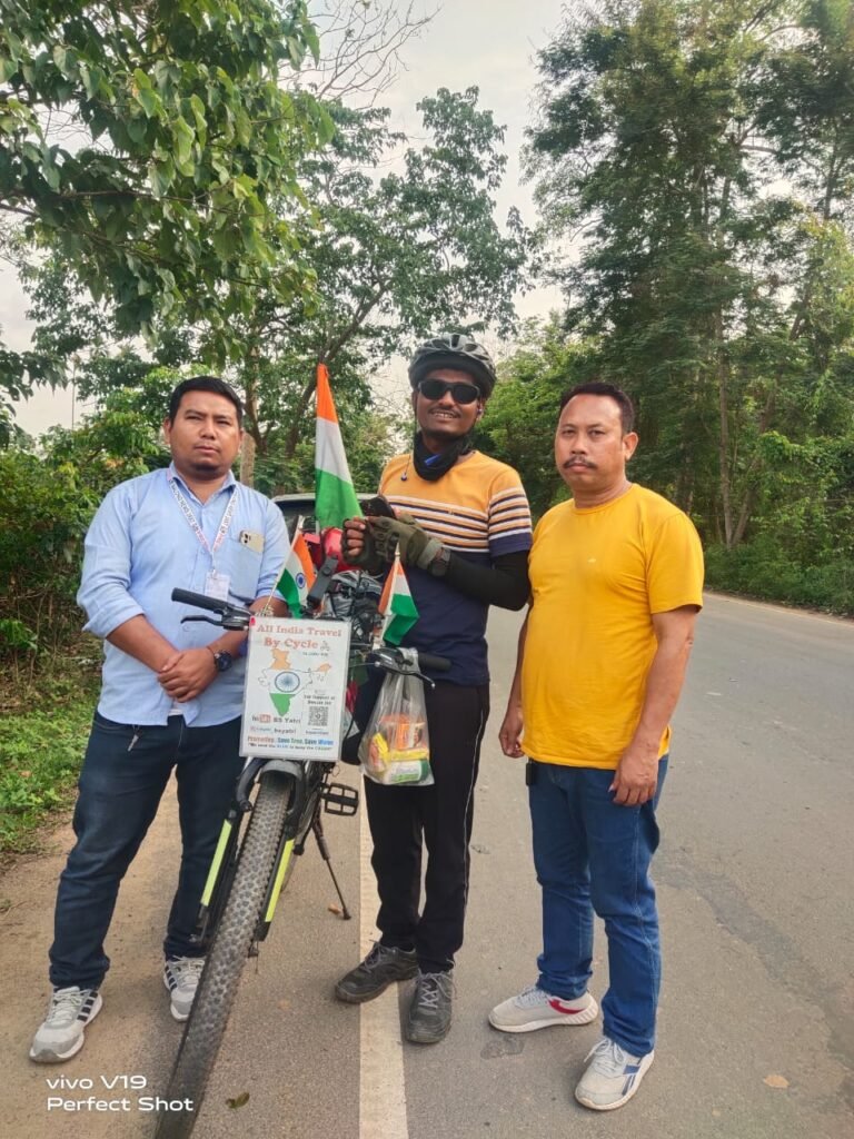 BOKAJAN, May 18: A team of media personnel encountered a 32-year-old solo cyclist Biswajit Singh at Bornirja, Deopani along National Highway 39 under Bokajan sub-division of Karbi Anglong District. During a personal interaction the cyclist told TDE that he hails from the state of Uttar Pradesh and had been cycling since 2022. He also said that the purpose of his solo trip across India is “To spread an awareness message on Oxygen use and availability, importance of trees and the importance of water.” Moreover he targets to travel all over India and has so far travelled across 21 states. Now, his target is to travel across the North Eastern part of India. His journey to North-East began from Nagaland and is currently cycling in Karbi Anglong District of Assam on which he informed about Itanagar of Arunachal Pradesh as his next stoppage. The cyclist also added that he would be cycling abroad after returning home from the North-Eastern states.